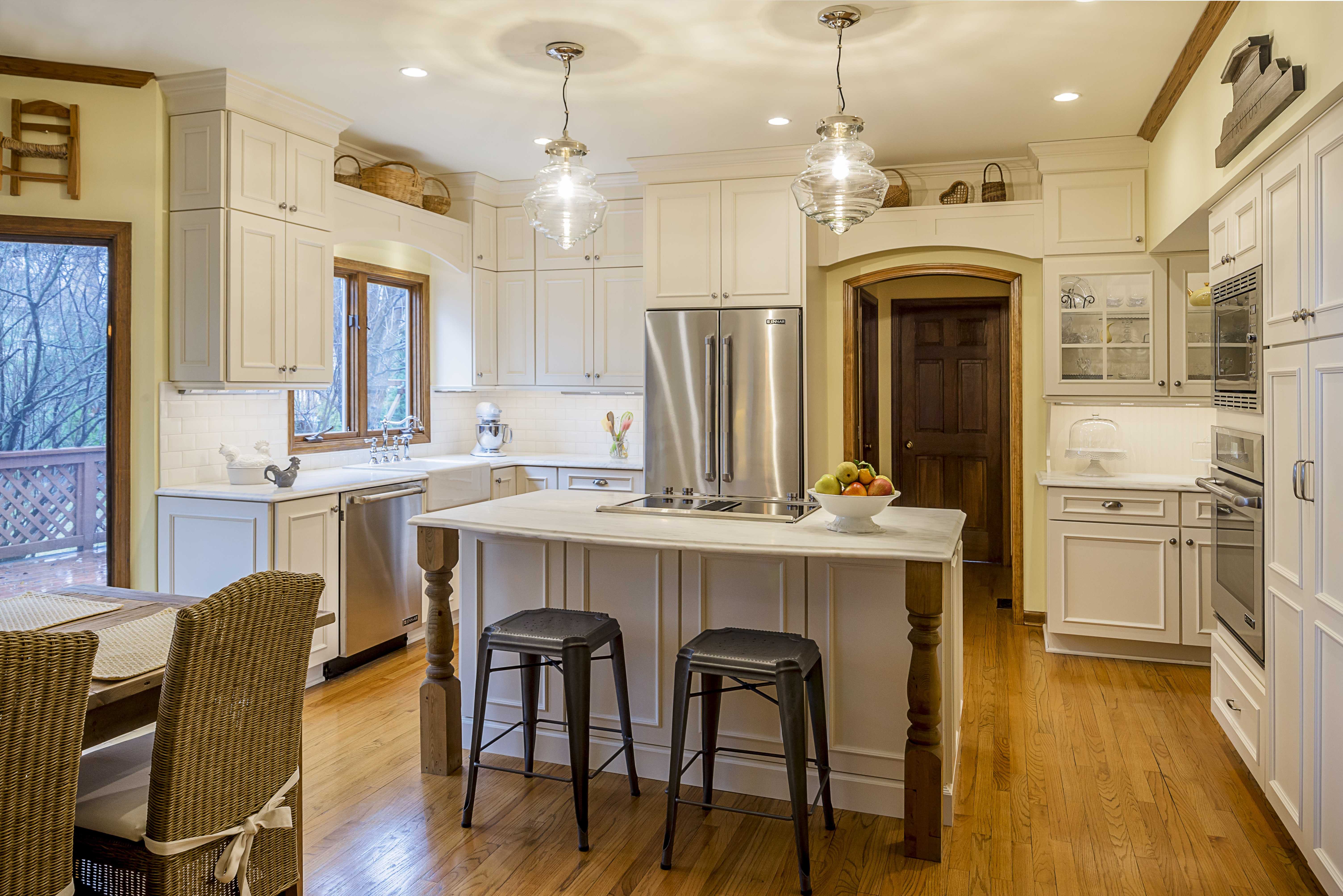 “My husband and I love the charm of the French Country kitchen, but wanted a fresher feel which is exactly what our designer, Brandie McCoy, gave us. To brighten things up, she suggested we use a soft, cream color for the cabinetry. This provides a beautiful complement to the warmer wood color of the kitchen table, door and window casings. We wanted to continue to display some of our country baskets, so Brandie designed a few open areas above the cabinets and archway for us to use. The centerpiece of the traditional French Country kitchen is a large, striking island which is exactly what we have and we are thrilled. It is perfect for baking and entertaining. The finishing touches are the beautiful apron sink and farmhouse lighting. This kitchen is everything we wanted and more,” said Nancy Wiersum.