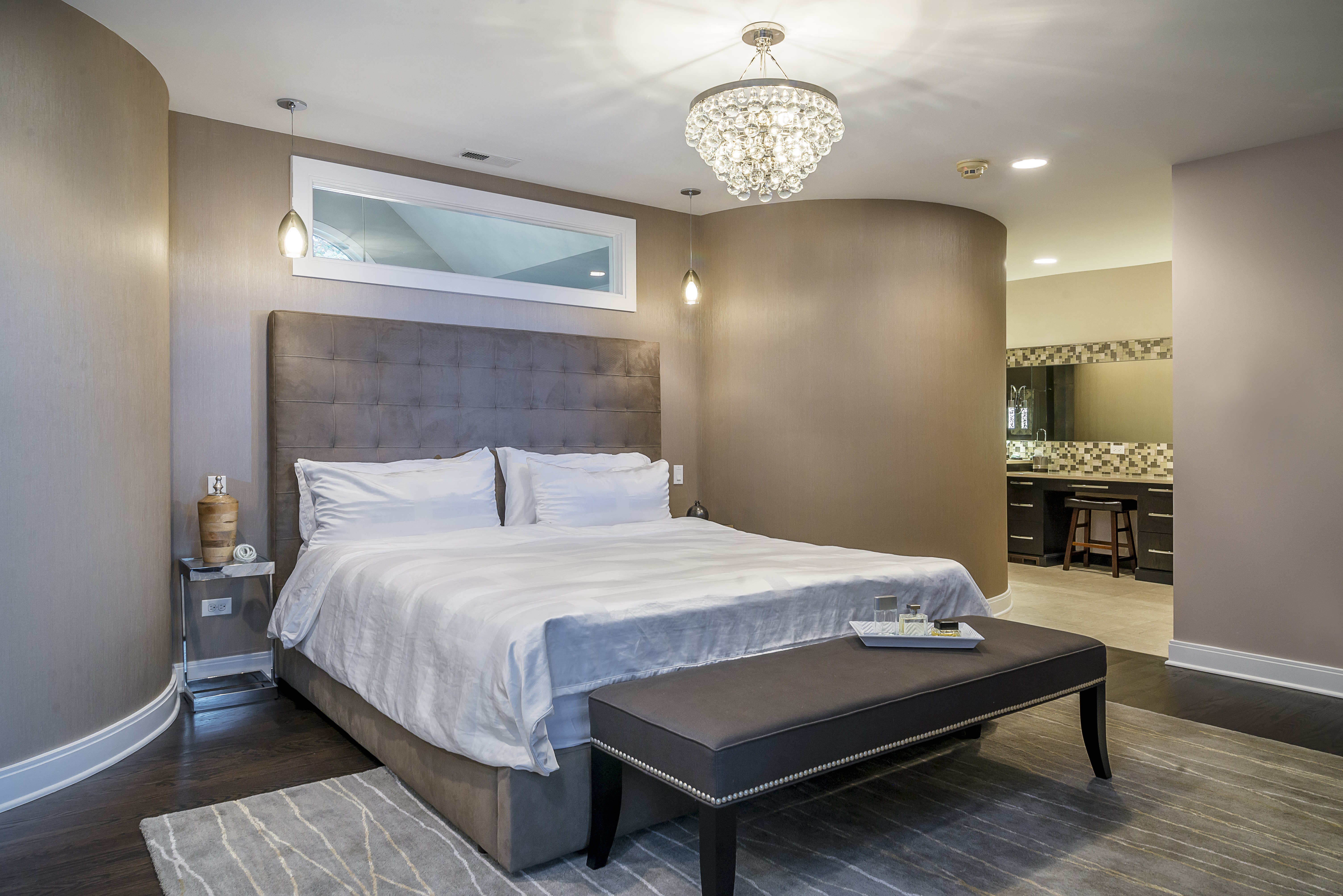 In the bedroom, gray is an excellent color because it creates a relaxing and soothing ambiance. Using light gray makes this bedroom look bright and open while enhancing the fantastic curves in the wall.