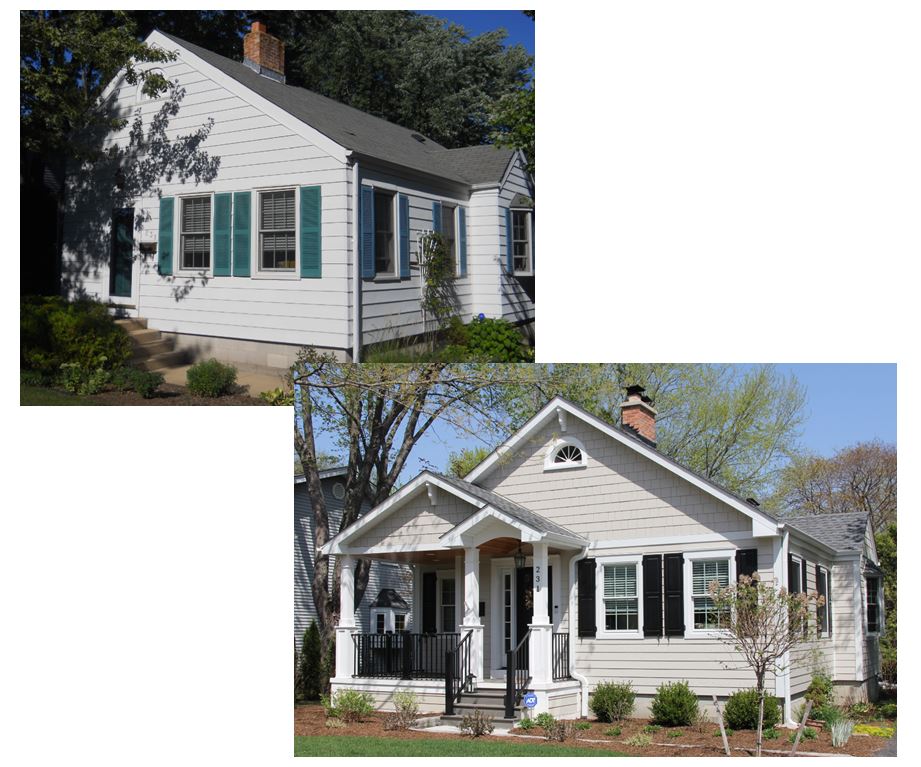 Our clients loved their home, but felt the exterior could use a little more charm. To add some much needed details, we first put on a new porch with decorative columns and portico. Next, we installed a stunning black front door that matched the new custom shutters. Finally, we re-clad the home in James Hardie lap and shingle siding, and added trim around the windows. Can you believe the difference this made in enhancing the home’s curb appeal?