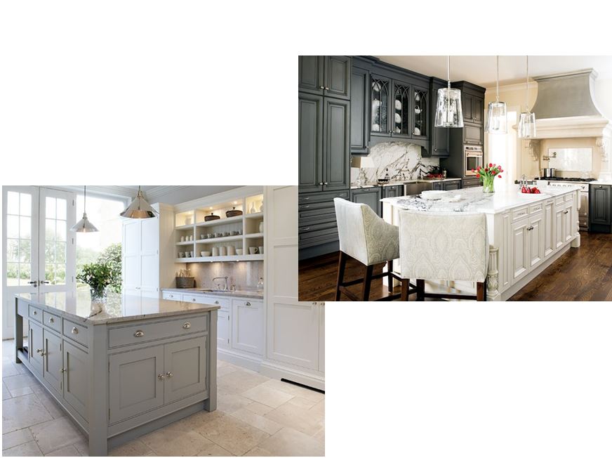 Gray gives a kitchen a touch of elegance as can been seen in this stunning kitchen remodel. Pairing dove gray islands with fresh white cabinets gives this kitchen a bright, sophisticated feel.