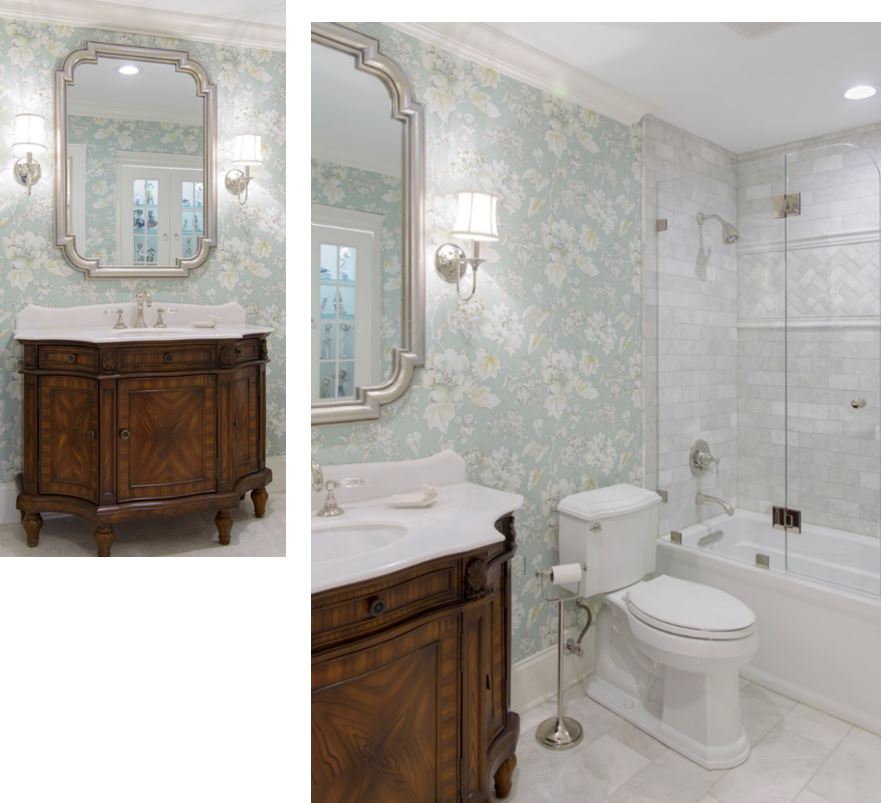 The hall bath turned out just as beautifully as the kitchen. With a furniture inspired vanity, European style shower door, soft gray tile, charming sconces and floral wallpaper, this bath is simply stunning proving that even smaller baths can impress.