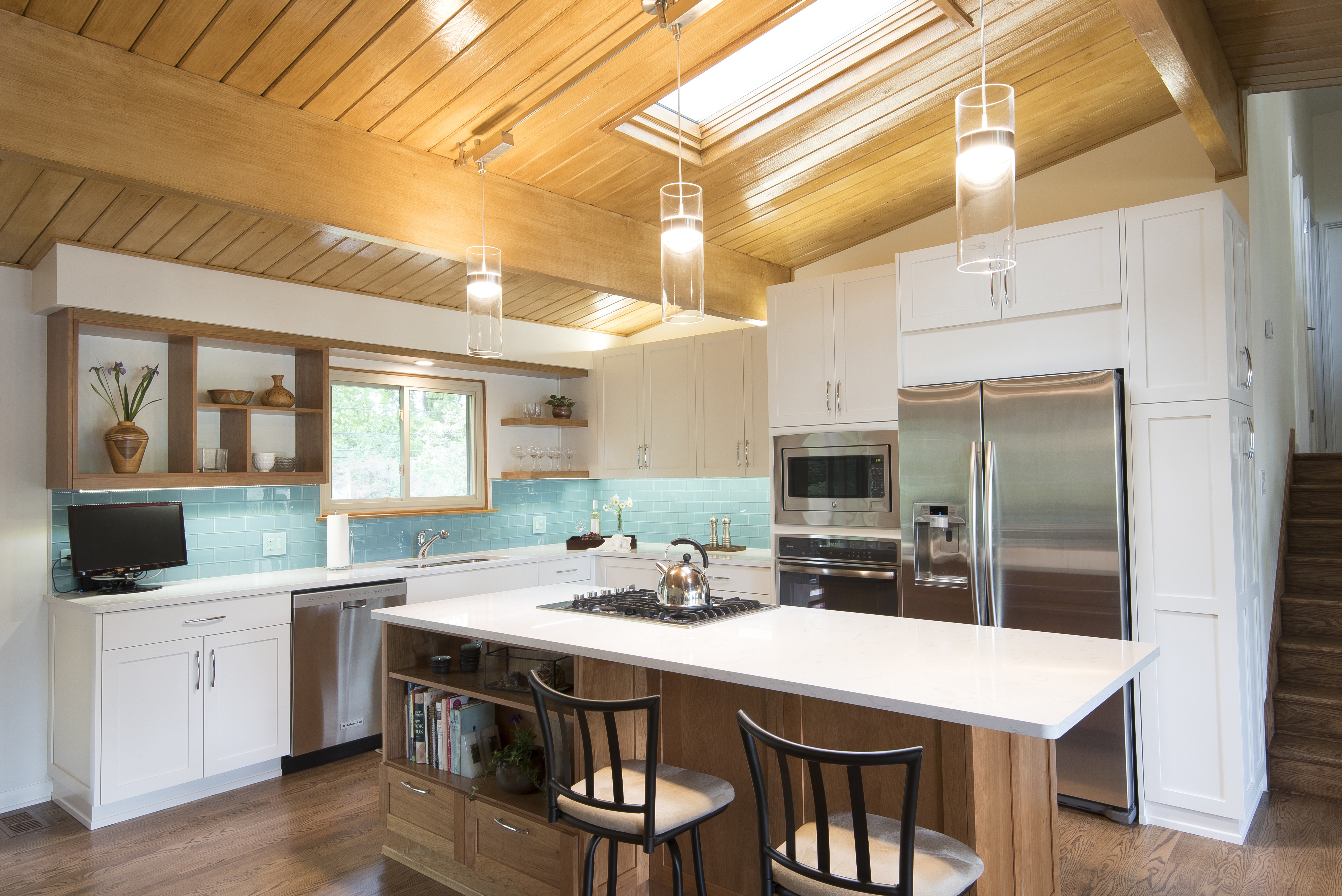 Many of these elements are exactly what our clients wanted to incorporate into the kitchen remodel of their fifties era home. “First and foremost, we wanted to open up and enlarge our kitchen to make it more functional. In addition, we wanted to bring in more natural light which meant adding windows overlooking our beautiful back yard. We wanted to keep some of the things we love most about our home, such as the beamed ceiling and wood floors, but refresh the overall look,” said the homeowner.