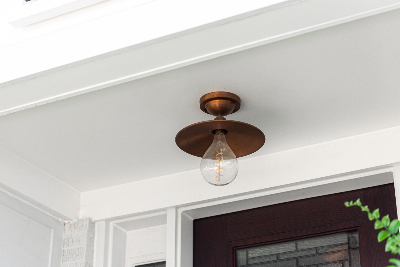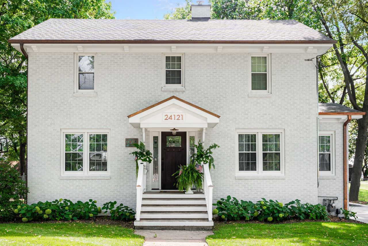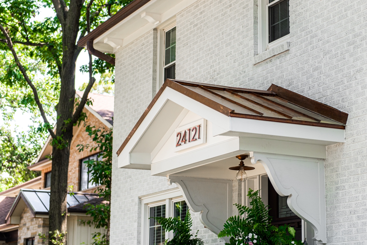 The exterior of this home has been totally refreshed. Staining the brick a soft white, adding a stylish new front porch and the copper accents give it enhanced curb appeal. Our talented client made the copper porch light himself.