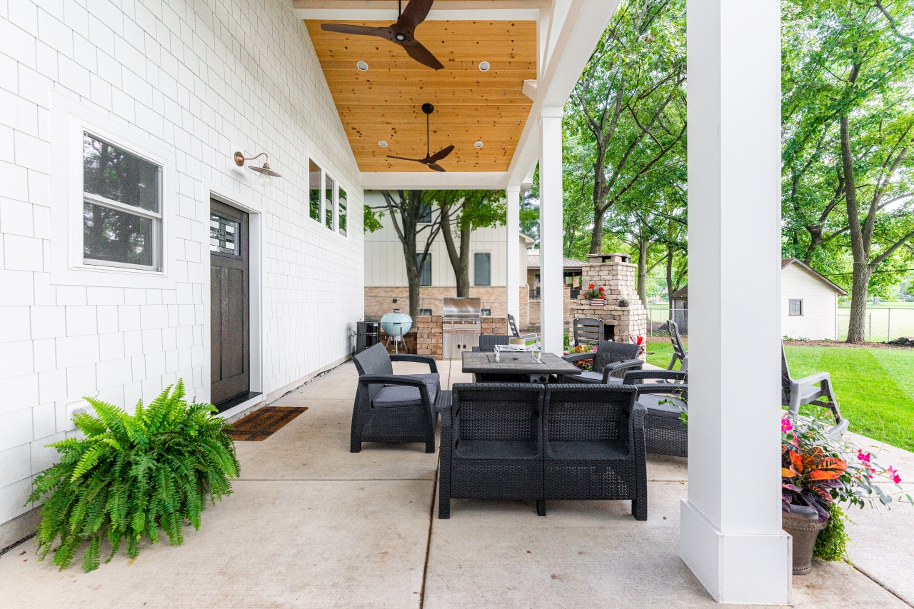 The entire back of the house was bumped out to allow for more room in the kitchen and a spacious new mudroom. The new exterior was clad in crisp, white James Hardie siding. A back porch was added with a two story vaulted ceiling, which can be used rain or shine. Our skilled clients built the outdoor fireplace themselves.