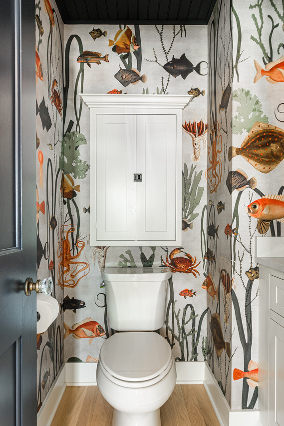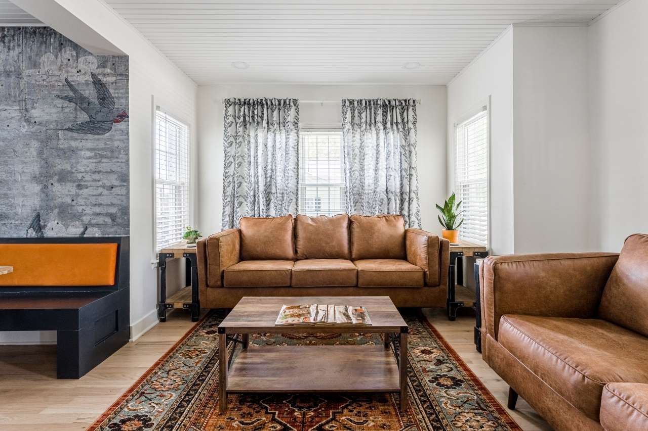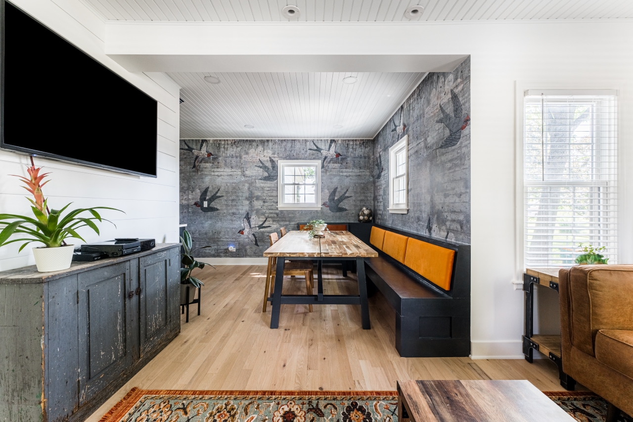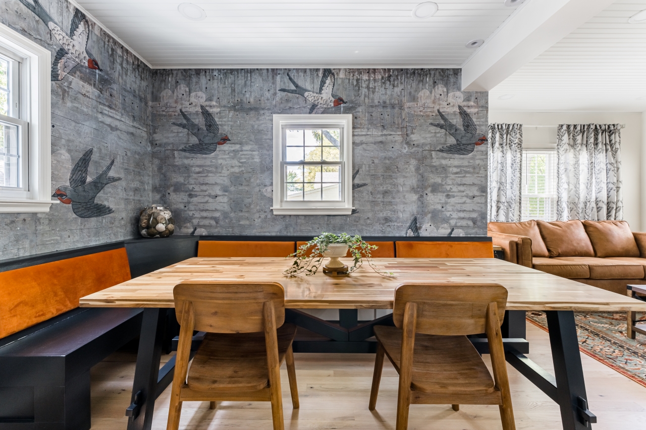 They chose mid-century design elements to complete their vintage home. Entirely decorated by the couple, the first floor of this home could easily be featured on HGTV or in a magazine. Gifted with immeasurable talent, the couple created several pieces for their home like the built-in banquette, unique table and light fixtures. The use of bold wallpaper patterns and retro colors create a unique feel that is absolutely fantastic.